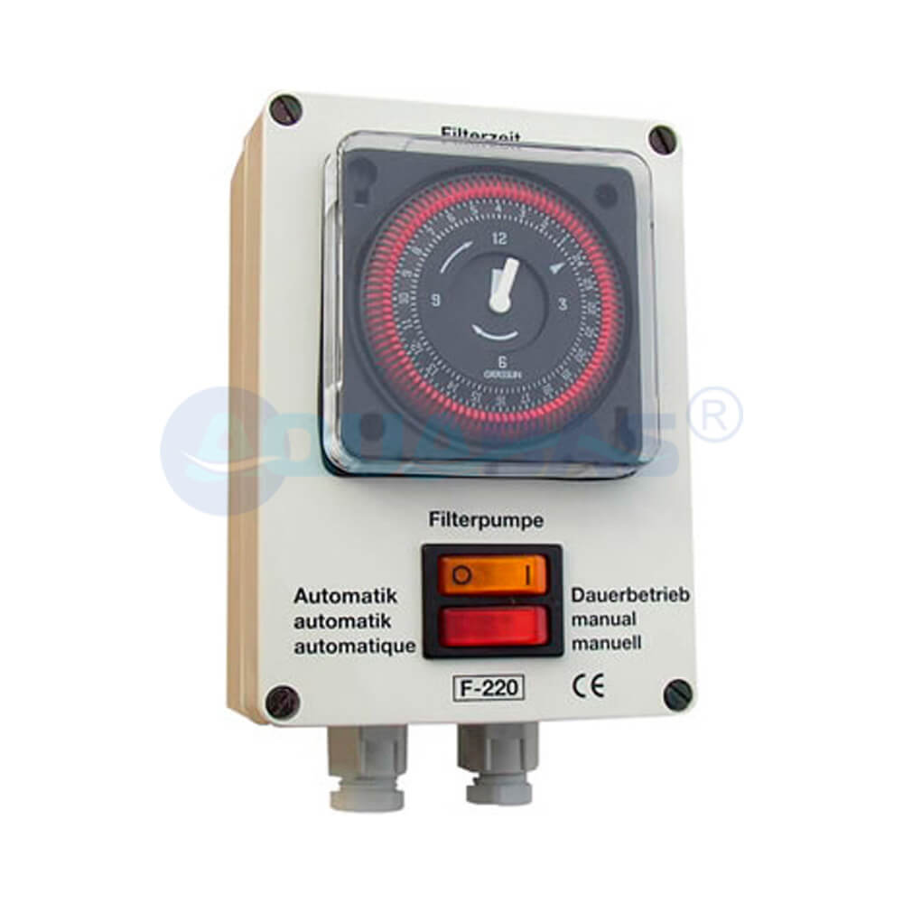 Блок управления фильтрацией OSF F-220 (309.000.0600) автоматизирует работу фильтровальной установки с помощью таймера, управляя однофазным насосом. Размещен в сером пластиковом корпусе и оснащен аналоговым таймером и кнопками управления (Вкл/Выкл, Ручной/Автомат).