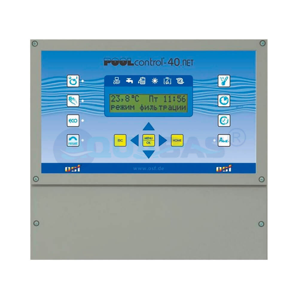 OSF POOL-Control-40.NET – щит управления для фильтрации и поддержания уровня воды в бассейнах (скиммерных и с переливным желобом). Он контролирует насос фильтрации (до 1 кВт) с помощью цифрового таймера и управляет уровнем воды.