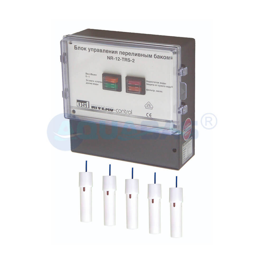 Система контроля уровня OSF NR-12-TSR-2 автоматизирует поддержание заданного уровня жидкости в бассейне. Система контролирует наполнение и долив воды, а также защищает насос фильтрации от "сухого хода". Управление осуществляется по сигналам от пяти датчиков. На лицевой панели блока расположены три контрольные лампы и выключатель питания. Датчики подключаются проводом сечением от 1,5 кв.мм, с возможностью удлинения до 100 метров. Предусмотрена регулировка времени работы электроклапана и насоса. Задержка срабатывания сигналов датчиков обеспечивает защиту от ложного включения системы долива, вызванного волнами. Наличие электроклапана необходимо для поддержания уровня воды в переливной емкости. Система оснащена отдельным программируемым сигнальным выходом.
