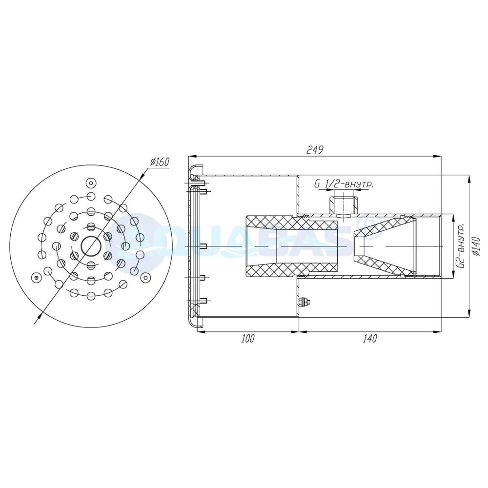 Форсунка гидромассажа производительностью 20-40 м³/ч (арт. ФГ.20/1) имеет закладную с резьбовым подсоединением 2 дюйма, поставляется в комплекте с эжектором и лицевой панелью.