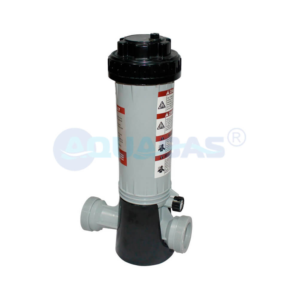Этот хлоратор оснащен встроенным регулятором дозирования растворенного хлора/брома, что позволяет точно регулировать подачу дезинфицирующего раствора в бассейн. Рекомендуется устанавливать его в конце системы водоподготовки, чтобы предотвратить повреждение другого оборудования химическими реагентами.