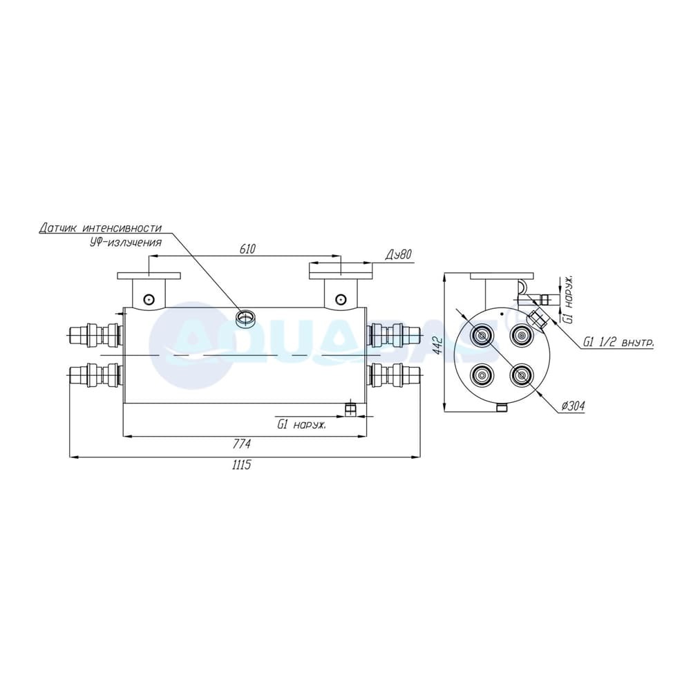 Производительность указана с учетом спада интенсивности излучения УФ-ламп в конце срока службы, а также коэффициента, учитывающего загрязнение кварцевых чехлов в процессе эксплуатации.
