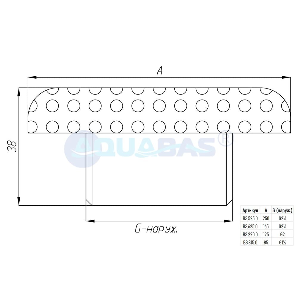 Данный водозабор арт. ВЗ.525.0 не имеет закладной части и монтируются на резьбу (например, через стеновой проход). Забор воды происходит через множество небольших отверстий диаметром 2-3 мм - это снижает вероятность захвата купальных принадлежностей, запутывания волос или присасывания тела купающихся. Данная модель может устанавливаться, как в дно, так и в борт бассейна.